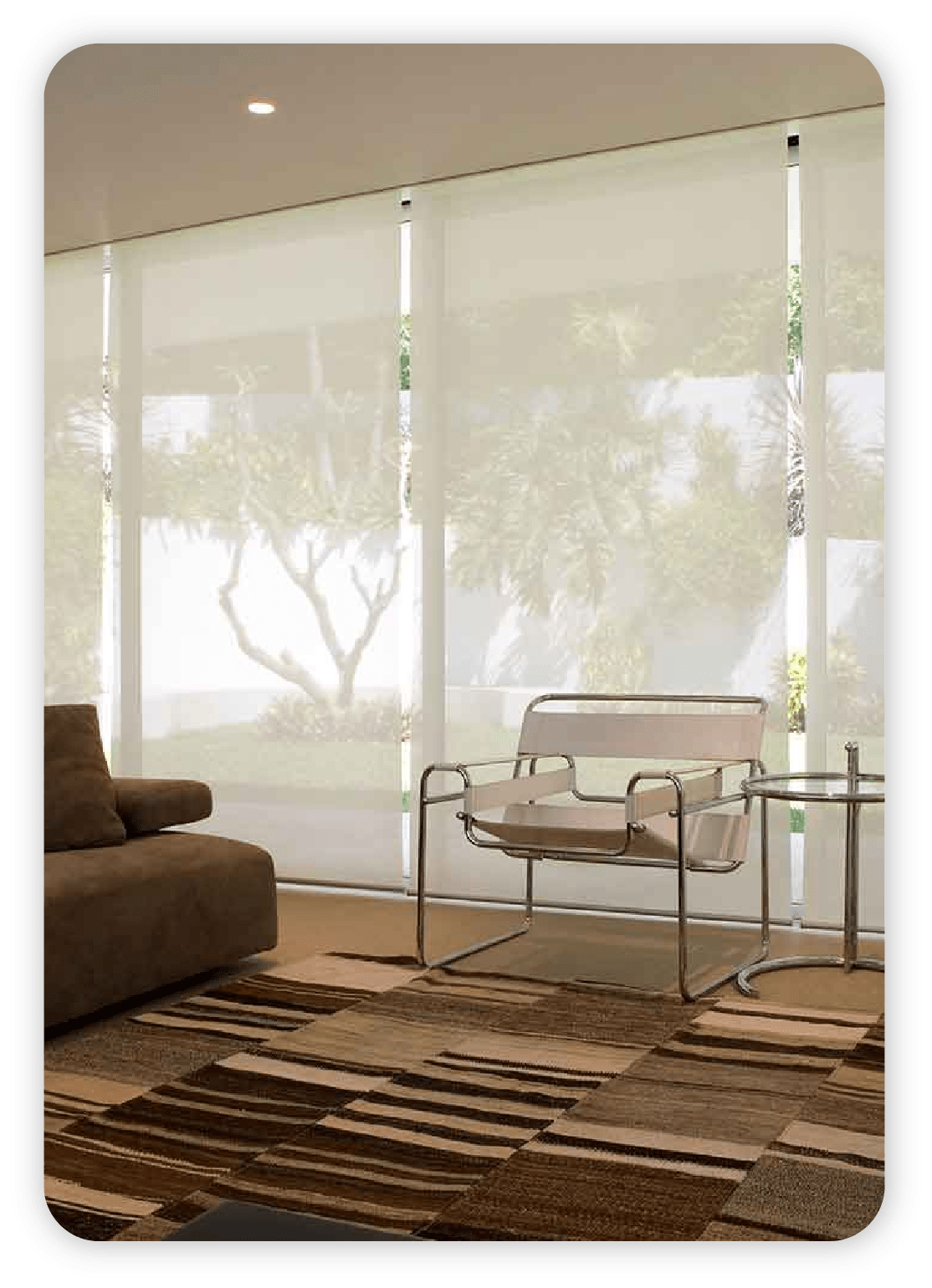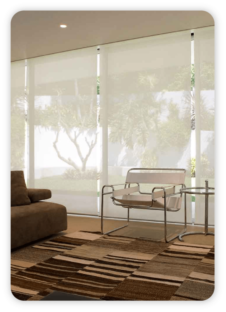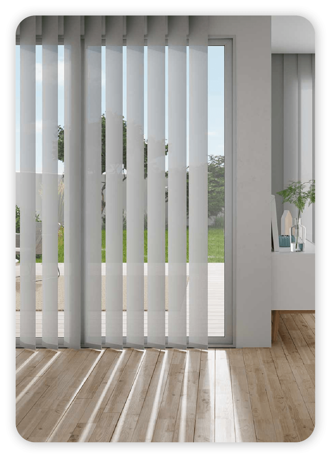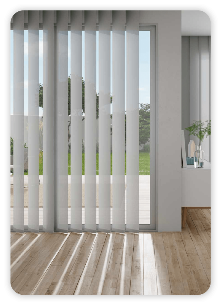 Se trata de un sistema de bandas verticales, con desplazamiento horizontal. Las bandas se desplazan sobre un perfil de aluminio, con excelente versatilidad para girar sobre su propio eje mediante su sistema de cordón. Se adaptan a distintos ambientes gracias a sus diferentes opciones de apertura. Son ideales para grandes superficies vidriadas, ya que la verticalidad de su diseño genera un efecto visual elegante y moderno.